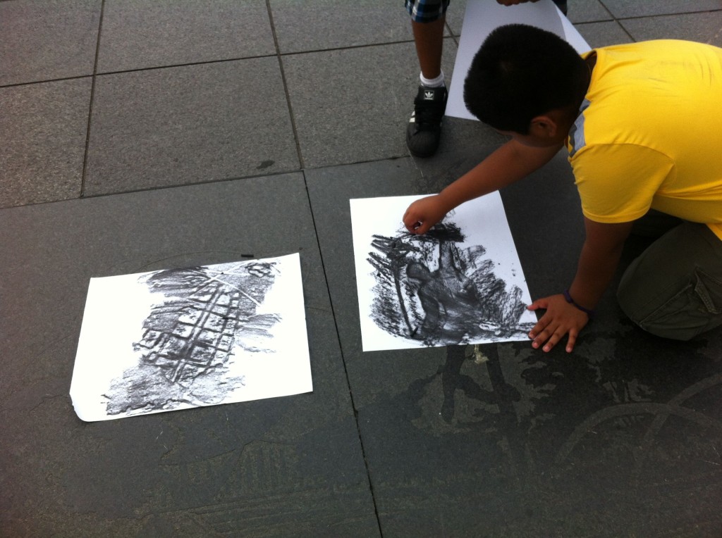 This photo (below) is from a rubbing activity that we did as part of the event where we created rubbings of a large floor mural that tells the story of the 1939 and 1964 World’s Fairs. We didn’t anticipate it, but as soon as we started, so many park-goers were interested in doing it as well. Luckily, Or had brought extra paper and we were all able to work on rubbings. A take-away from our feedback session after the event was that it would be nice to extend this engagement into a conversation, interview, or even have these spontaneous participants join for the rest of the event.